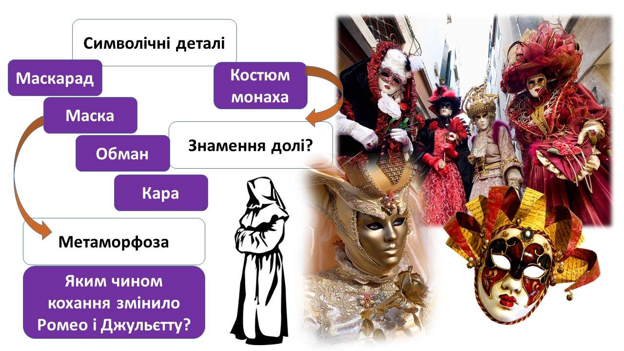 Методичний коментар. 1) Словникова робота: Маскарад – це бал, на якому присутні люди, одягнені в різні характерні національні, історичні або фантастичні костюми, здебільшого з масками на обличчях. Маску як посередника між світом реальним і містичним люди використовували здавна, вона супроводжувала весь цикл людського життя від народження до смерті, втілювала дух померлих предків (створювала ефект присутності), служила для охорони від злих намірів (символ захисту, таємниці, небуття). Маска служила також предметом ідентифікації: людина в ній відчувала себе іншою, створювався ефект перевтілення (трансформації), тому носіння маски часто асоціюється з образами кокона й метелика. Але маску можна сприймати і як символ обману, ілюзії, двійництва. 2) Питання до учнів: – Які з наведених значень образу маски асоціюються у вас із п’єсою Шекспіра? Роздуми учнів тут можуть вивести на цікаві стежки аналізу твору, адже виходить, що маскарад в умовах родової ворожнечі був єдиним можливим способом познайомити Ромео і Джульєтту, але він і програмував наступну трагедію, адже обман, ілюзія не можуть привести до позитивних результатів. Ромео одягає костюм монаха, але монахи ніколи не можуть мати родину, вони приречені на самотність.