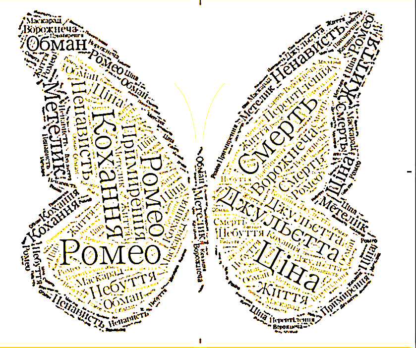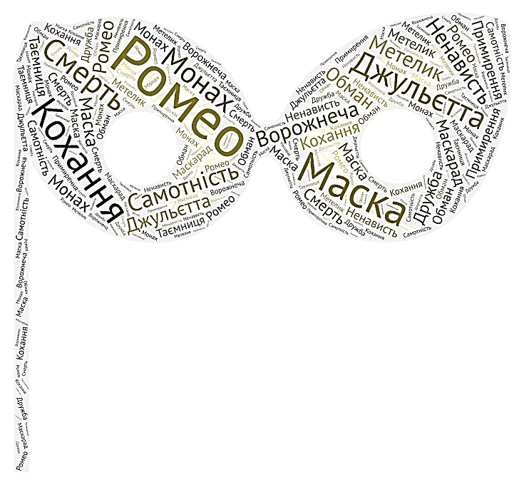 Кохання змінює Ромео і Джульєтту на краще, вони дорослішають, навчаються кохати, втрачають юнацький егоїзм (відбувається метаморфоза), але воно і вбиває героїв (ставши новими, кращими, вони переходять у небуття або у кращий для них світ). Таким чином, ми бачимо, що маска і маскарад є ключовими символами трагедії «Ромео і Джульєтта». 3) Можна запропонувати учням створити власну візуалізацію образів-символів п’єси у вигляді «хмари» слів (наприклад, у програмі Word Art), колажу, власної ілюстрації.